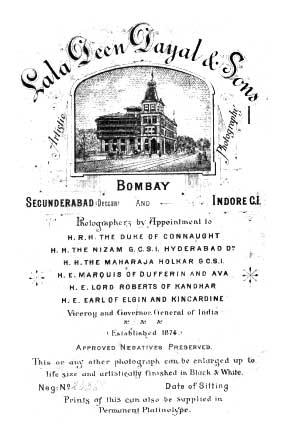 There is an interesting story behind the birth of the Secunderabad studio. The story goes that the Nizam’s army commander and personal secretary asked Deen Dayal to invite the Nizam to his place which was a small area in a temporary building. The Nizam agreed to be photographed in his uniform at the studio. Within 24 hours the shamiana tent was erected (Deen Dayal had his own portable studio about 30 feet by 20 feet with muslin on one side for light). The place was decorated with simple furniture, carpets and sofas. The dress which the Nizam would wear was laid out. The Nizam arrived at the studio at 8 am for he had to attend a parade at 9 am after the sitting. Deen Dayal received him on the roadside and showered silver coins to the waiting crowd after turning them over the Nizam . The full staff of Deen Dayal saluted the Nizam in the Moglai style and the Nizam was most pleased with the honour bestowed on him and the elaborate makeshift arrangement for the occasion. After dressing, about 8-10 pictures were taken. The Nizam then asked his ADC whether this place belonged to the photographer and he was told that Deen Dayal had taken this on rent about a month back. The conversation took place when the Nizam was having tea and he ordered that the place which was in his jagir(property) should be permanently presented to Deen Dayal. Thus was laid the foundation of the larger studio which was patronised by the Nizam’s noblemen and British army officers.The studio was situated in the centre of Secunderbad towards the Parade grounds and the Nizam used to come to Deen Dayals twice a year at the New Year Parade and H.M. King George's Birthday Parade on 3rd June. The Nizam used to change his civil dress into a full brocade and velvet uniform before going to the March Past about half km away. There was a large garden at the back of the studio with several mango and guava trees. On the north side he had a big stable where the firm had three carriages and five horses ready at any time of the day. The zenana studio was another memorable entity. The purdah system was so widely entrenched in Hyderabad that no wise commercial establishment could have ignored its existence. Managed by one Mrs. Leverick, it did not lack the supervision of Deen Dayal. While the ladies were dressing in the ante room, Dayal set up everything and instructed Mrs. Leverick. She had to just press the shutter and take the required pictures with various exposures and backgrounds which were all set beforehand. Despite the special facilities, there were very few women who opted to be photographed. In fact we do not have a single picture of Deen Dayal’s wife. |